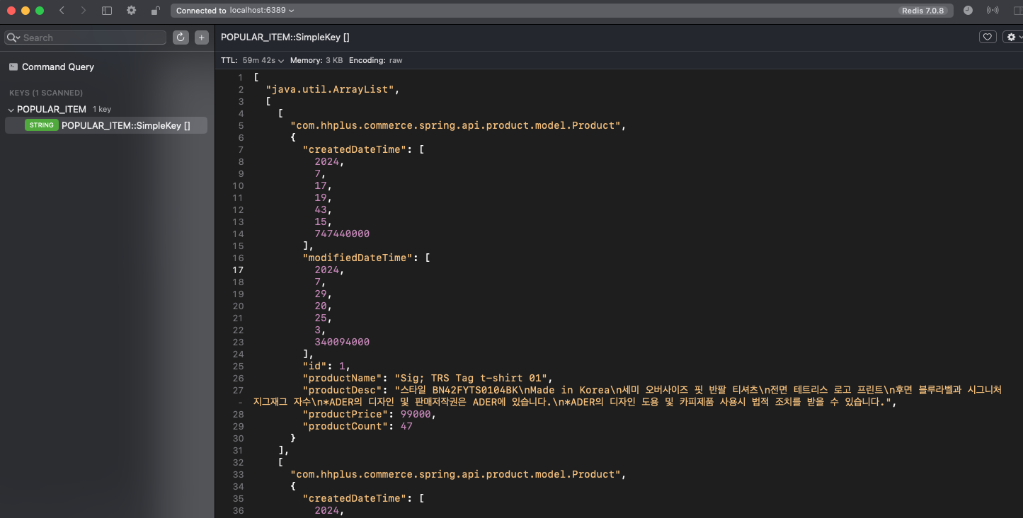 @Transactional(readOnly = true) @Cacheable("POPULAR_ITEM") public List<Product> getPopulars() { return orderItemRepository.selectPopularOrderItems(); }4.2.5 상위 상품 목록 조회 API 요청 후 Radis 적재 데이터 확인