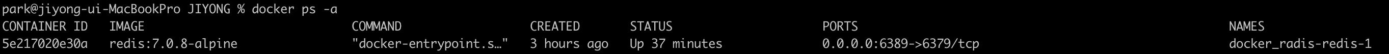 version: "3.8" services: redis: image: redis:7.0.8-alpine ports: - "6389:6379" command: redis-server /usr/local/etc/redis/redis.conf volumes: # 마운트할 볼륨 설정 - /Users/park/Dev/JIYONG/docker_radis/data - /Users/park/Dev/JIYONG/docker_radis:/usr/local/etc/redis/redis.conf restart: always4.1.2. 작성한 docker-compose.yaml 실행
