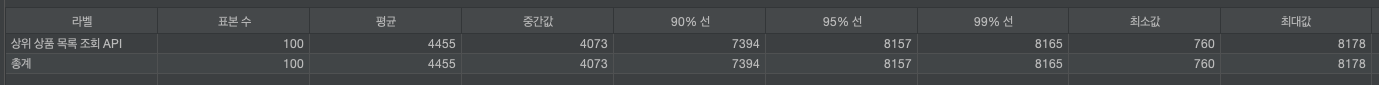 - JMeter를 사용하여 부하 테스트를 진행 1초 동안 100명의 사용자의 쓰레드를 생성하고 상위 상품 목록조회 API를 1번씩 요청