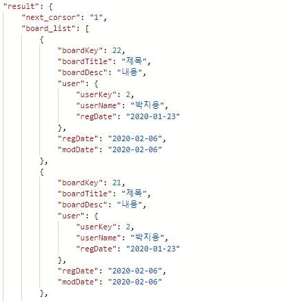 @RequestMapping(value = "", method = RequestMethod.GET) public @ResponseBody BusinessResultVo getBoardList(HttpServletRequest request, Pageable pageable, @RequestParam(value="user_key", required = false) Long userKey) throws CustomException { BusinessResultVo businessResultVo = new BusinessResultVo(); try { String nextCorsor = null; Optional<UserVo> user = userService.getUser(userKey); if(user.isPresent() == false) { throw new InvalidUserkeyUnauthorizedException(statusVo.userkeyInvalidCode, "[BoardController.boardDelete] : {userKey = " + userKey + "}, errorMsg = " + statusVo.userkeyInvalidDesc); } Page<BoardVo> pageList = boardService.selectBoardList(user, pageable); List<BoardVo> boards = pageList.getContent(); if(!pageList.isLast()) { nextCorsor = String.valueOf(pageable.getPageNumber() + 1); } businessResultVo.addResult("next_corsor", nextCorsor); businessResultVo.addResult("board_list", boards); } catch (CustomException ex) { businessResultVo.setCode(ex.getCode()); businessResultVo.setDesc(ex.getDesc()); throw ex; } return businessResultVo; }Response Body 부분에 Pageable 선언하여 요청을 페이징 처리에 대한 Input 값들을 받습니다.