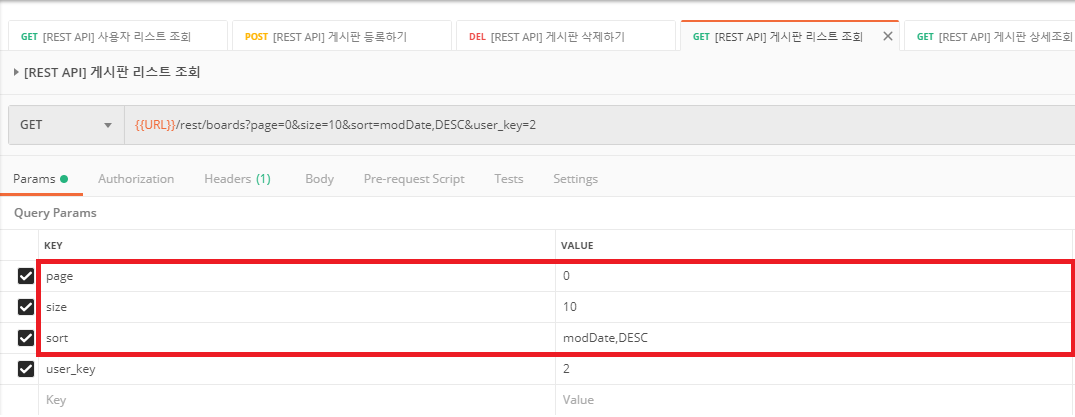 @RequestMapping(value = "", method = RequestMethod.GET) public @ResponseBody BusinessResultVo getBoardList(HttpServletRequest request, Pageable pageable, @RequestParam(value="user_key", required = false) Long userKey) throws CustomException { BusinessResultVo businessResultVo = new BusinessResultVo(); try { String nextCorsor = null; Optional<UserVo> user = userService.getUser(userKey); if(user.isPresent() == false) { throw new InvalidUserkeyUnauthorizedException(statusVo.userkeyInvalidCode, "[BoardController.boardDelete] : {userKey = " + userKey + "}, errorMsg = " + statusVo.userkeyInvalidDesc); } Page<BoardVo> pageList = boardService.selectBoardList(user, pageable); List<BoardVo> boards = pageList.getContent(); if(!pageList.isLast()) { nextCorsor = String.valueOf(pageable.getPageNumber() + 1); } businessResultVo.addResult("next_corsor", nextCorsor); businessResultVo.addResult("board_list", boards); } catch (CustomException ex) { businessResultVo.setCode(ex.getCode()); businessResultVo.setDesc(ex.getDesc()); throw ex; } return businessResultVo; }Response Body 부분에 Pageable 선언하여 요청을 페이징 처리에 대한 Input 값들을 받습니다.