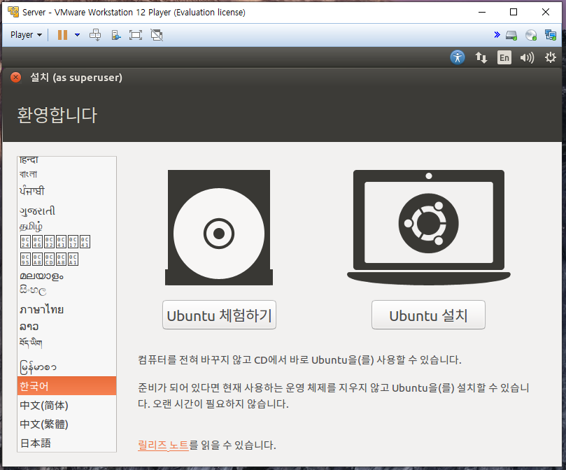 4. 부팅이 완료되면 한국어 선택 후 해상도 셋팅을 위해 Ubuntu 체험하기 버튼 클릭