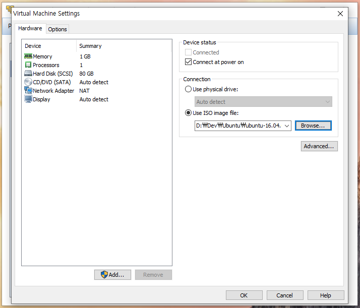 2. CD/DVD 선택 후 Use ISO image file에서 다운받은 우분투 ISO 파일 경로 선택 후 OK 버튼 클릭
