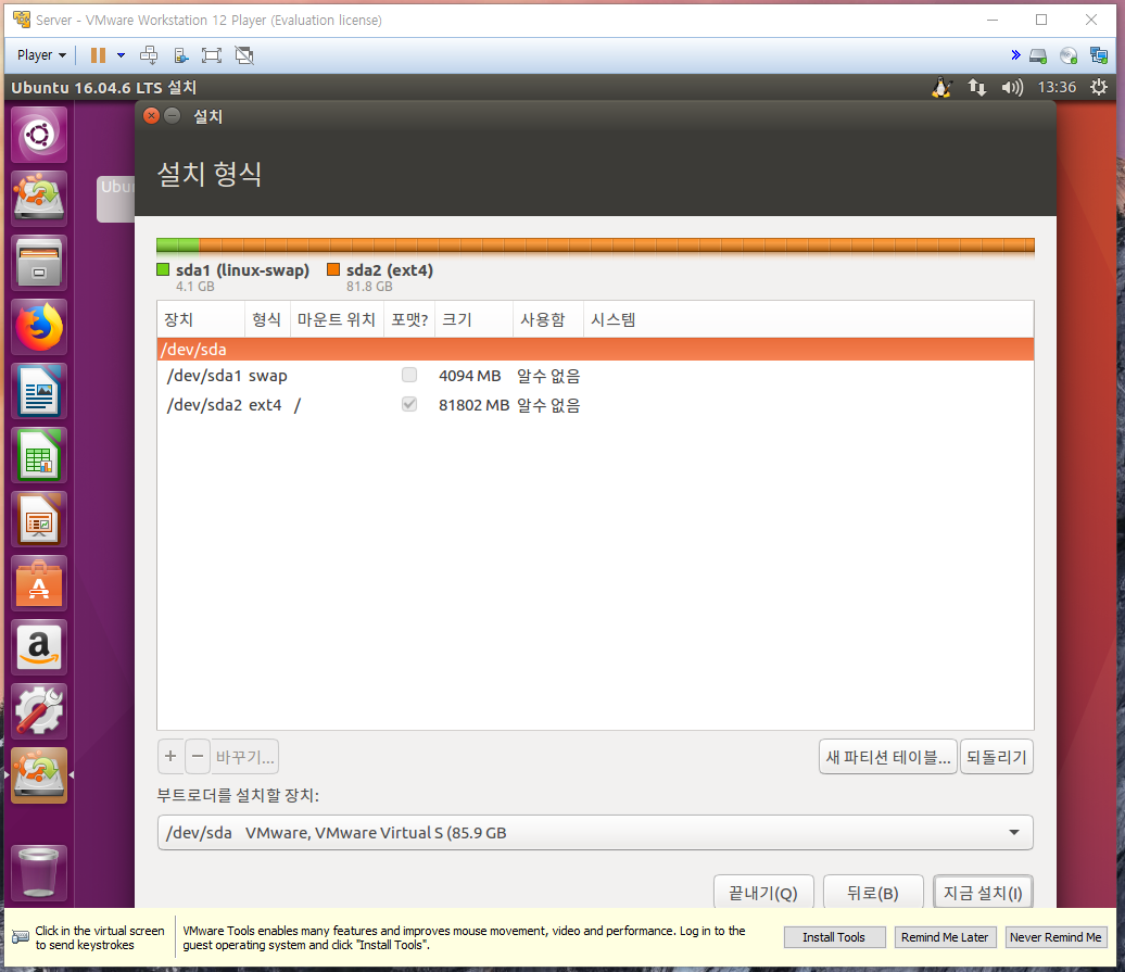 7. 파티션 설정 후 지금 설치 버튼 선택 이후 나오는 언어 선택 및 사용자 계정 설정을 후 설치 완료
