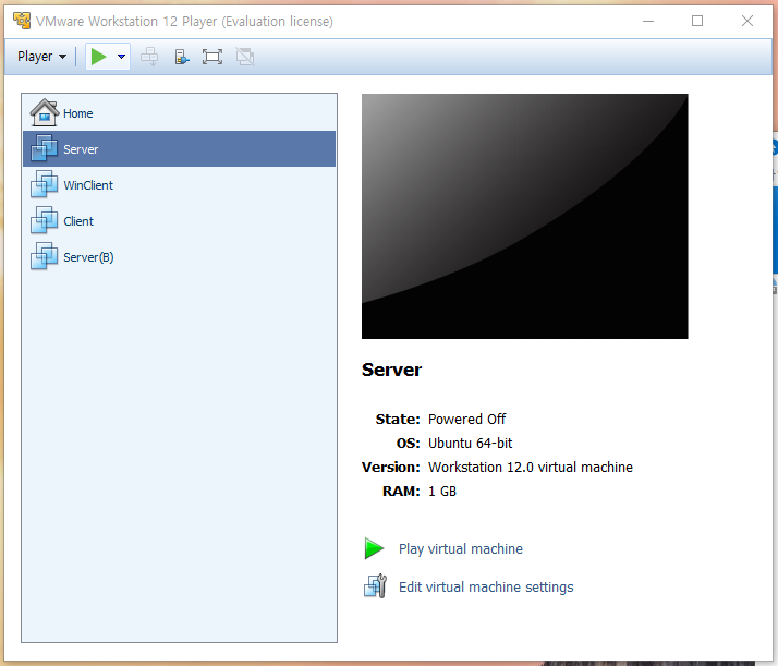1. VMware Player 실행 후 우분투를 설치하고자 하는 Server 선택 후 Edit vit... 선택하기