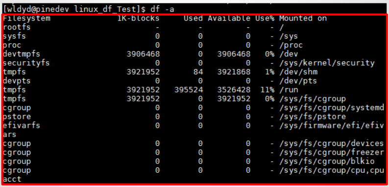 - a : 블록의 파일 시스템을 포함하여, 모든 파일 시스템을 출력(데이터를 저장하는 단위가 0블록인 파일까지 모두 출력)