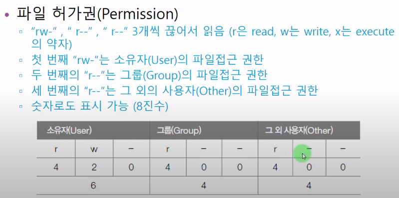 - 파일 소유권 : 파일을 소유한 사용자와 그릅을 의미