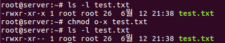 chmod o-x test.txt 명령어를 실행하여 일반 사용자의 실행 권한을 제거 그룹 권한에 쓰기 권한을 추가하고 싶을때