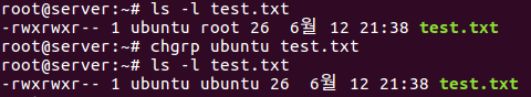 chgrp ubuntu test.txt 명령어를 사용하여 파일의 소유 그룹을 변경 chown 명령어는 root 사용자만 사용할 수 있다.