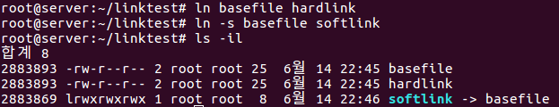 하드 링크와 심볼릭 링크 생성 ls -il 명령어로 inode 확인 하드 링크와 베이스 파일의 inode가 같은 걸 확인 softlink(심볼릭 링크)는 베이스 파일과 inode가 다른걸 확인 할 수 있다.