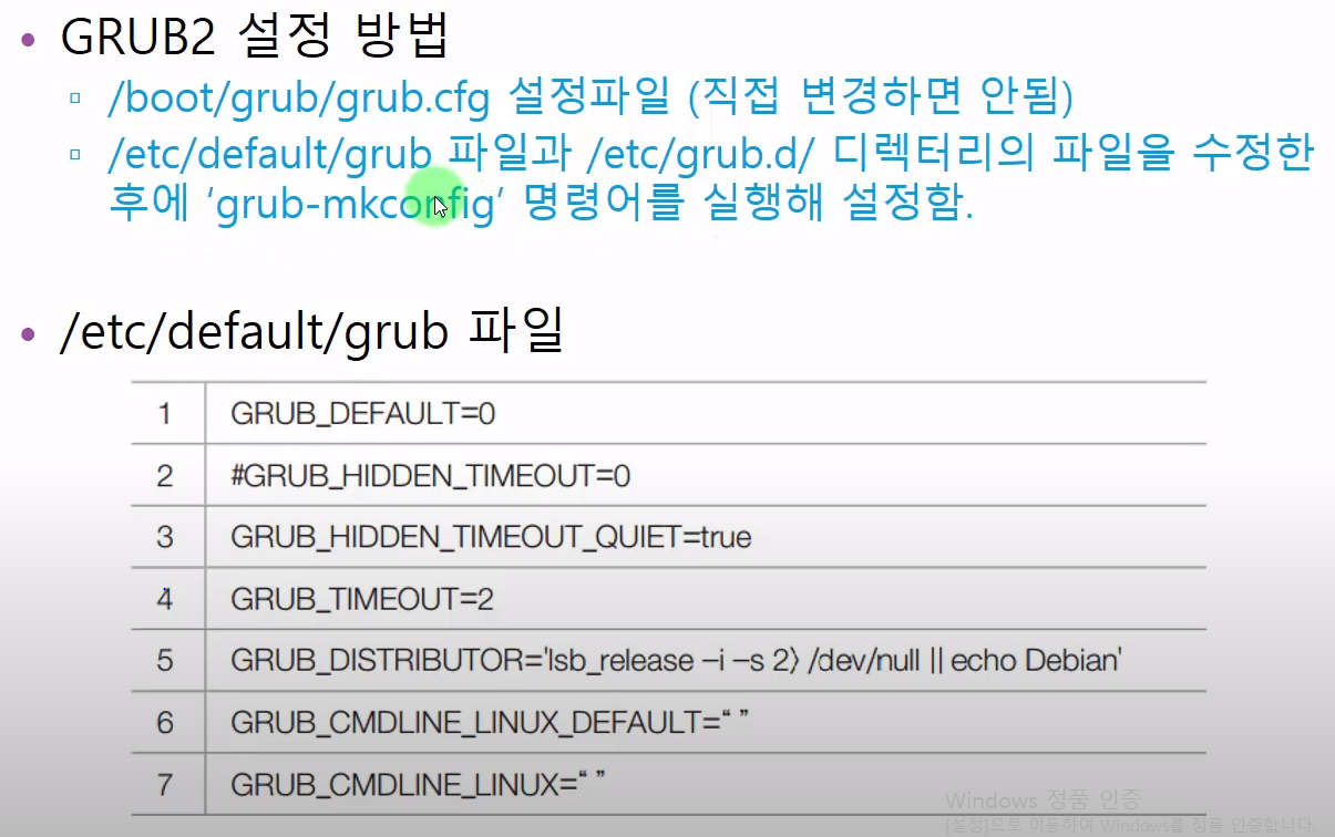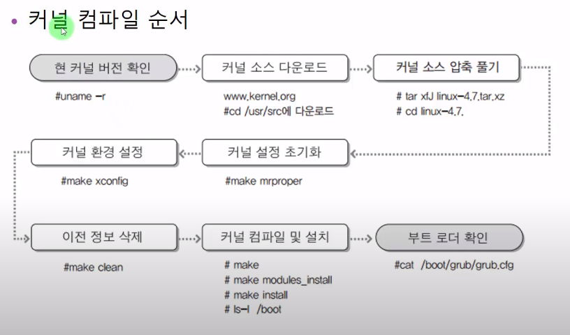$ vi /etc/default/grub - GRUB_TIMEOUT=20 - GRUB_DISTRIBUTOR="This is Linux" - 수정 및 저장 후 $ update-grub $ reboot - 부팅 시간이 20분으로 변경되고 부팅 이름이 This is Linux로 변경되었다. $ vi /etc/grub.d/00_header - 해당 파일 하단에 아래 내용 작성 - cat << EOF - set superusers="grubuser" //grubuser 이름의 사용자만 그룹을 편집할 수 있게 - password grubuser 4321 //패스워드 설정 - EOF $ update-grub $ reboot - 부팅 화면에서 알파벳 대문자 E키 누르기 - 해당 grubuser가 아니면 부팅 화면으로 다시 돌아가는걸 확인할 수 있다.모듈의 개념과 커널 컴파일의 필요성