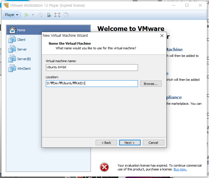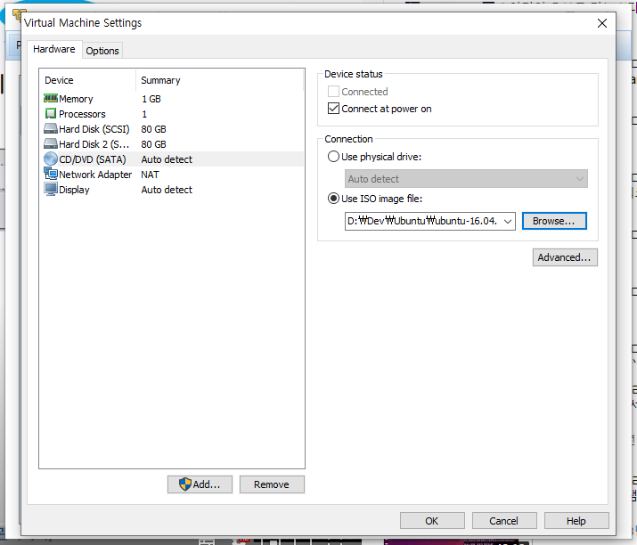 3. 생성된 Server의 CD에 Ubuntu-16.06.ios 파일 선택하여 실행 4. 생성한 RAID1번 Server 실행해여 우분투 설치 프로그램 부팅 후 설치 진행